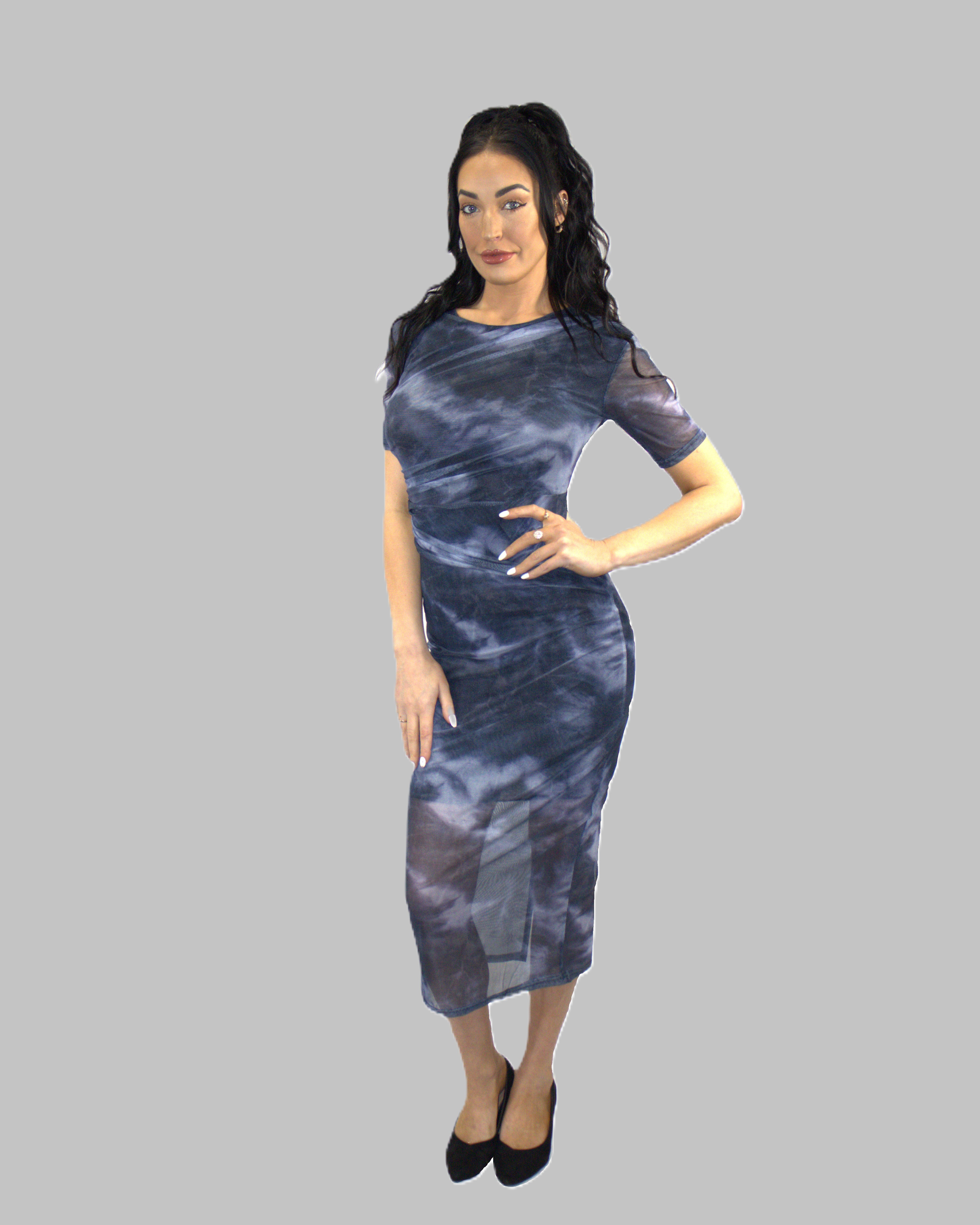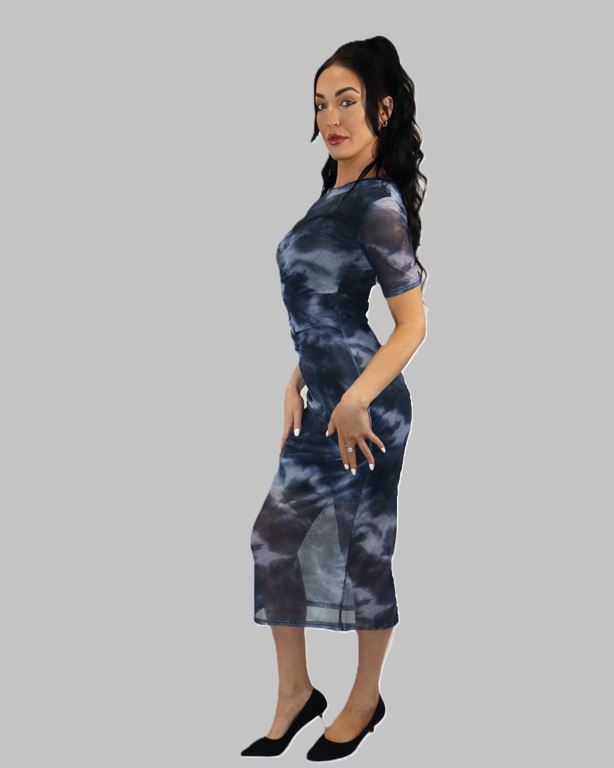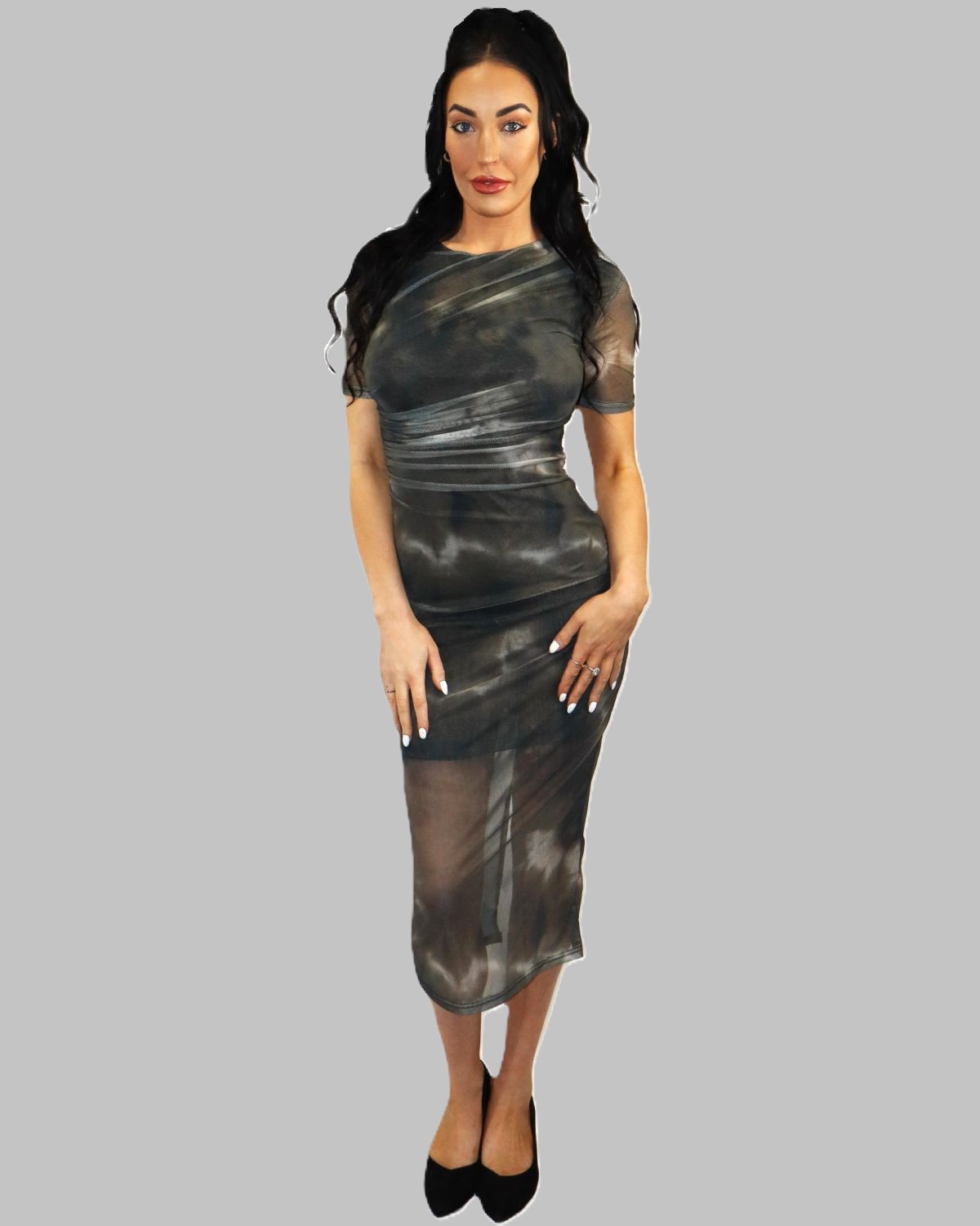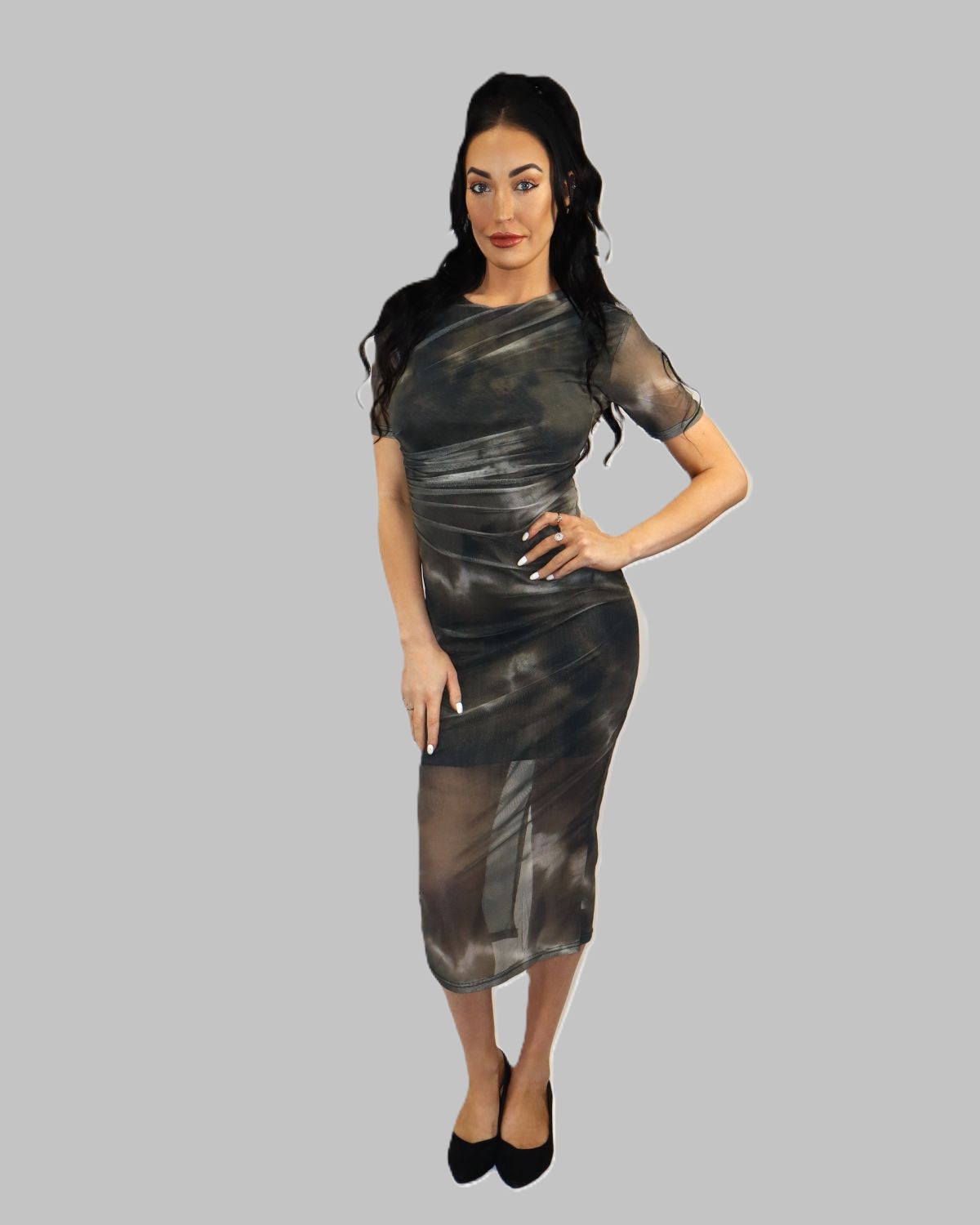 Ruched Mesh Bodycon Dress With Velvet Pattern