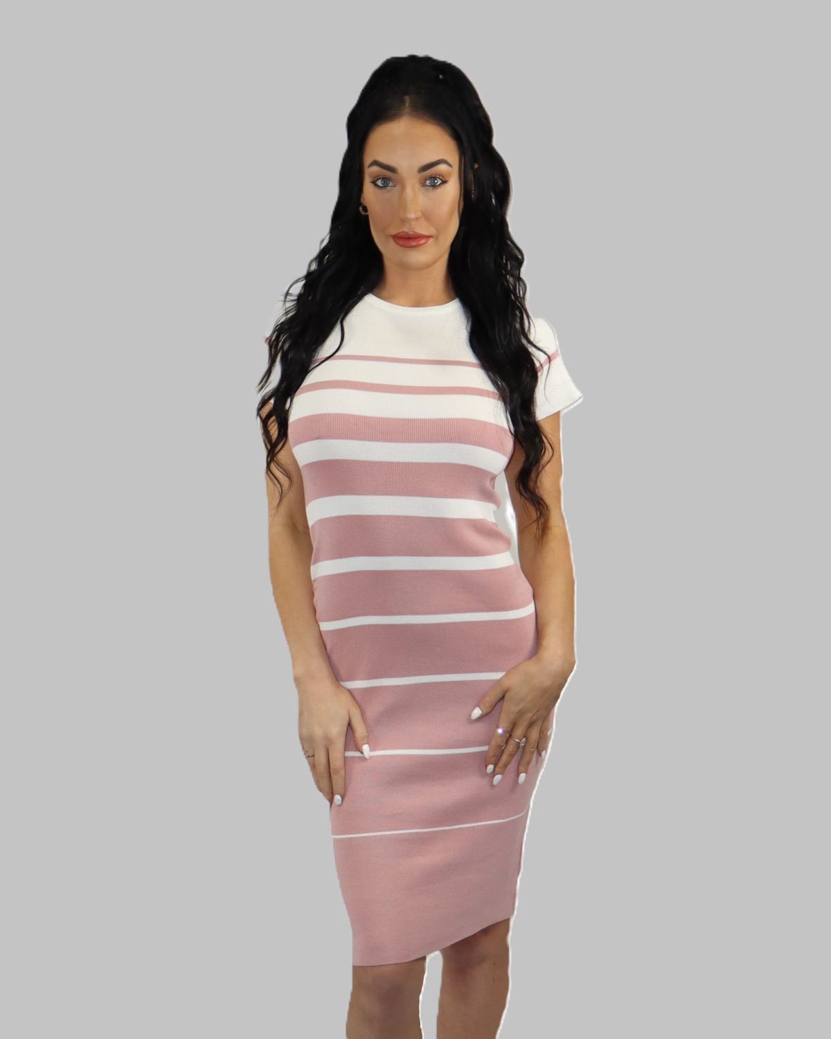 Light Pink and white striped knit dress with medium-thick stretch knit fabric