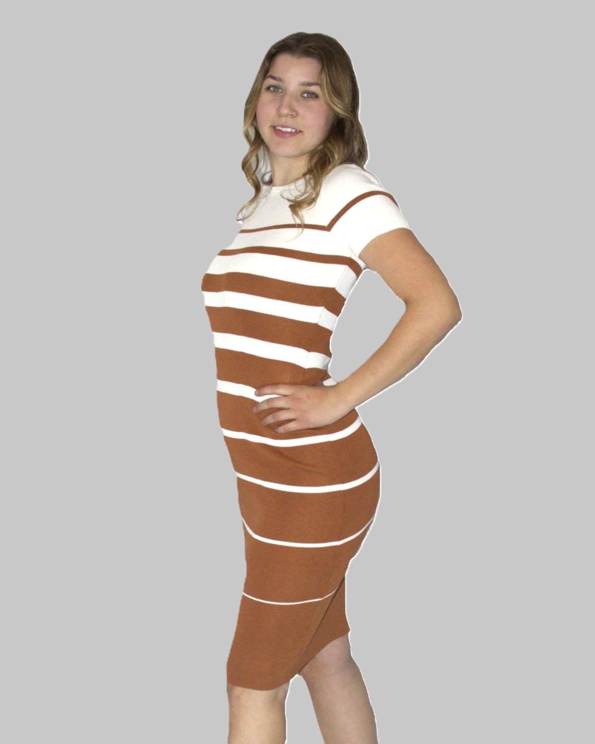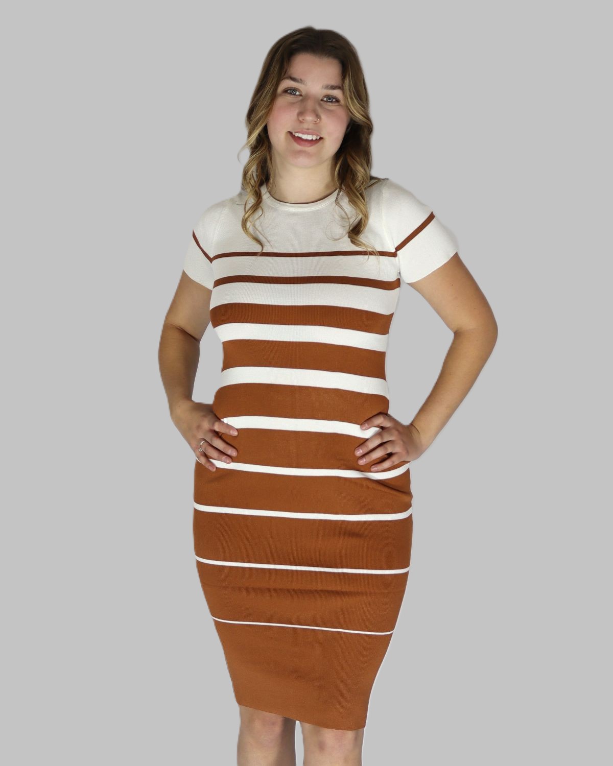 Rust and white striped knit dress with medium-thick stretch knit fabric
