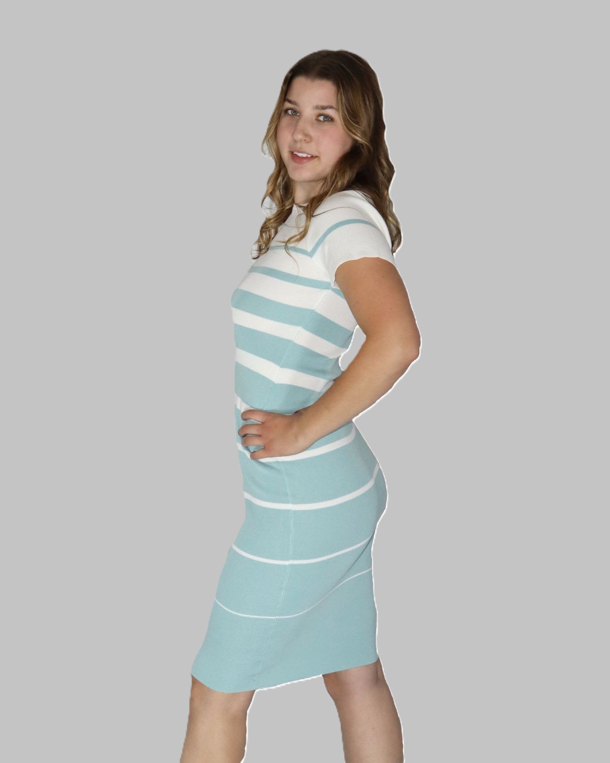 Light Blue and white striped knit dress with medium-thick stretch knit fabric
