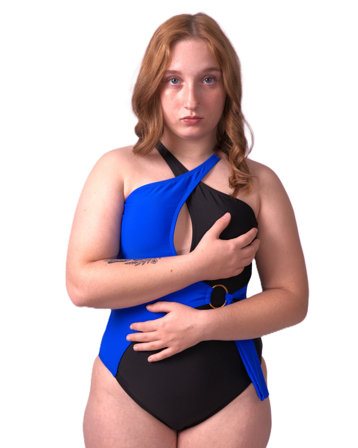 Black One-Piece Swimsuit with Cross Front & Mesh Detail