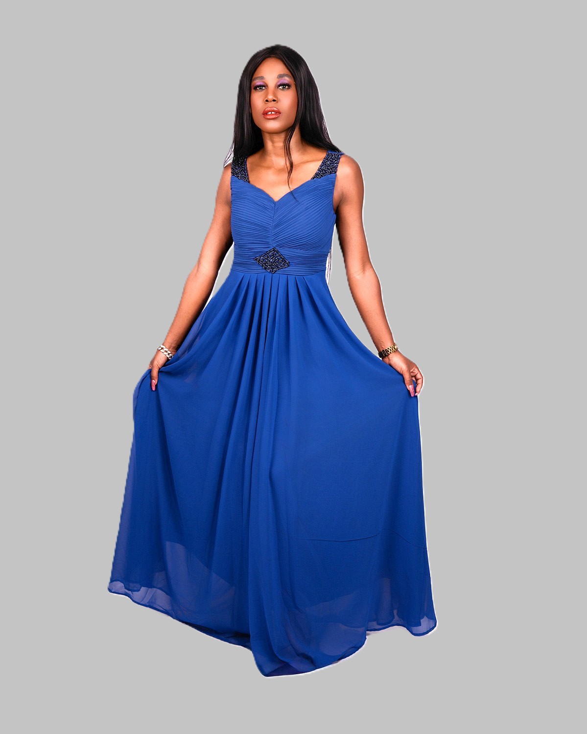 Make a statement in this breathtaking royal blue evening gown, designed for unforgettable moments. The dress features a fitted bodice with pleated detailing and sparkling embellishments along the straps and center chest, adding a touch of refined glamour. The full-length skirt flows effortlessly, creating a graceful silhouette with every step.