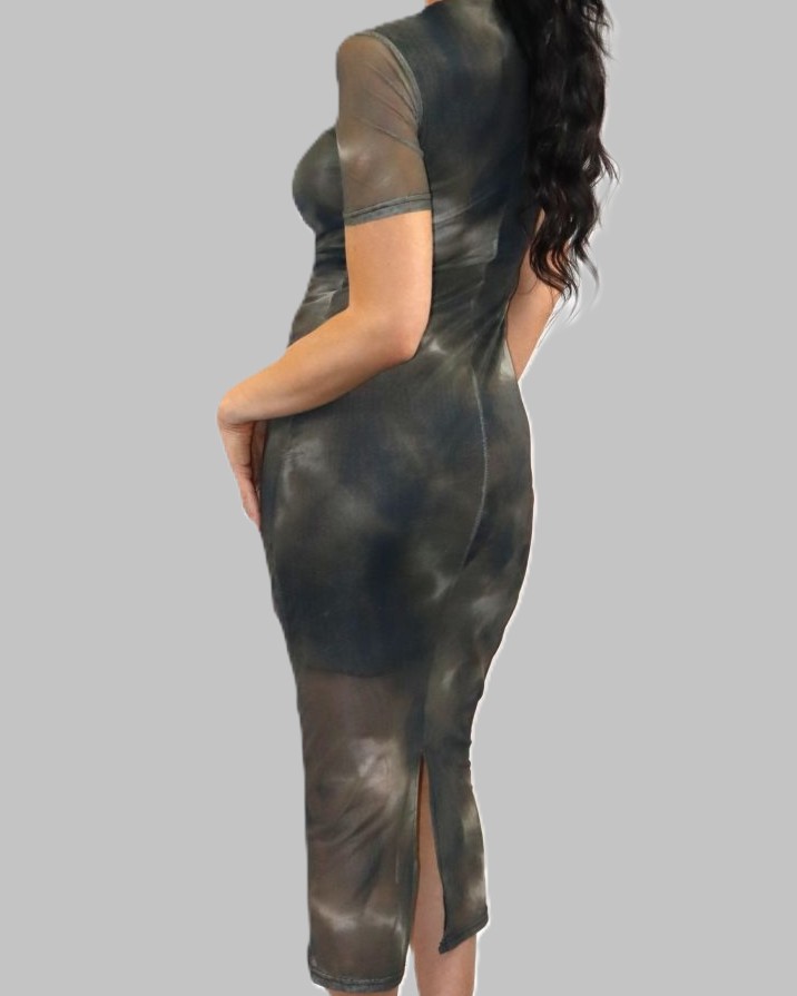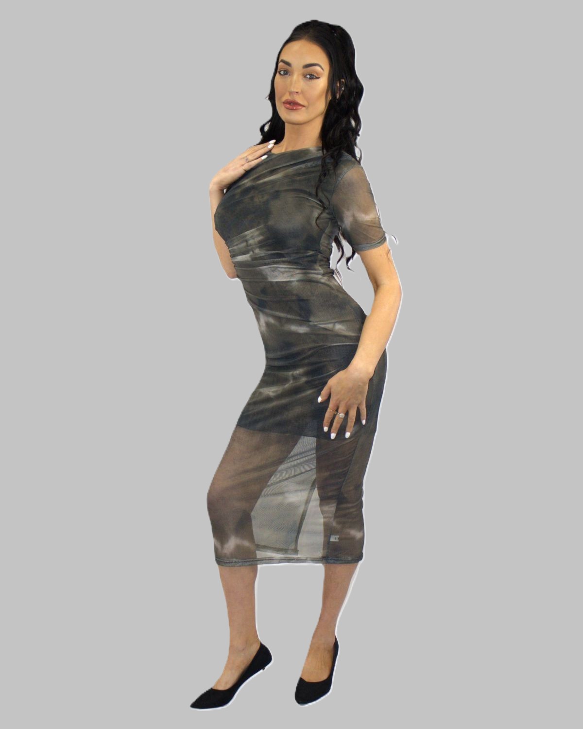 Make a bold statement with this sleek bodycon midi dress, designed with a soft mesh overlay and a smooth inner lining for comfort. The eye-catching green abstract pattern adds a modern, artistic touch, while the side slit brings a hint of allure and makes movement easy.