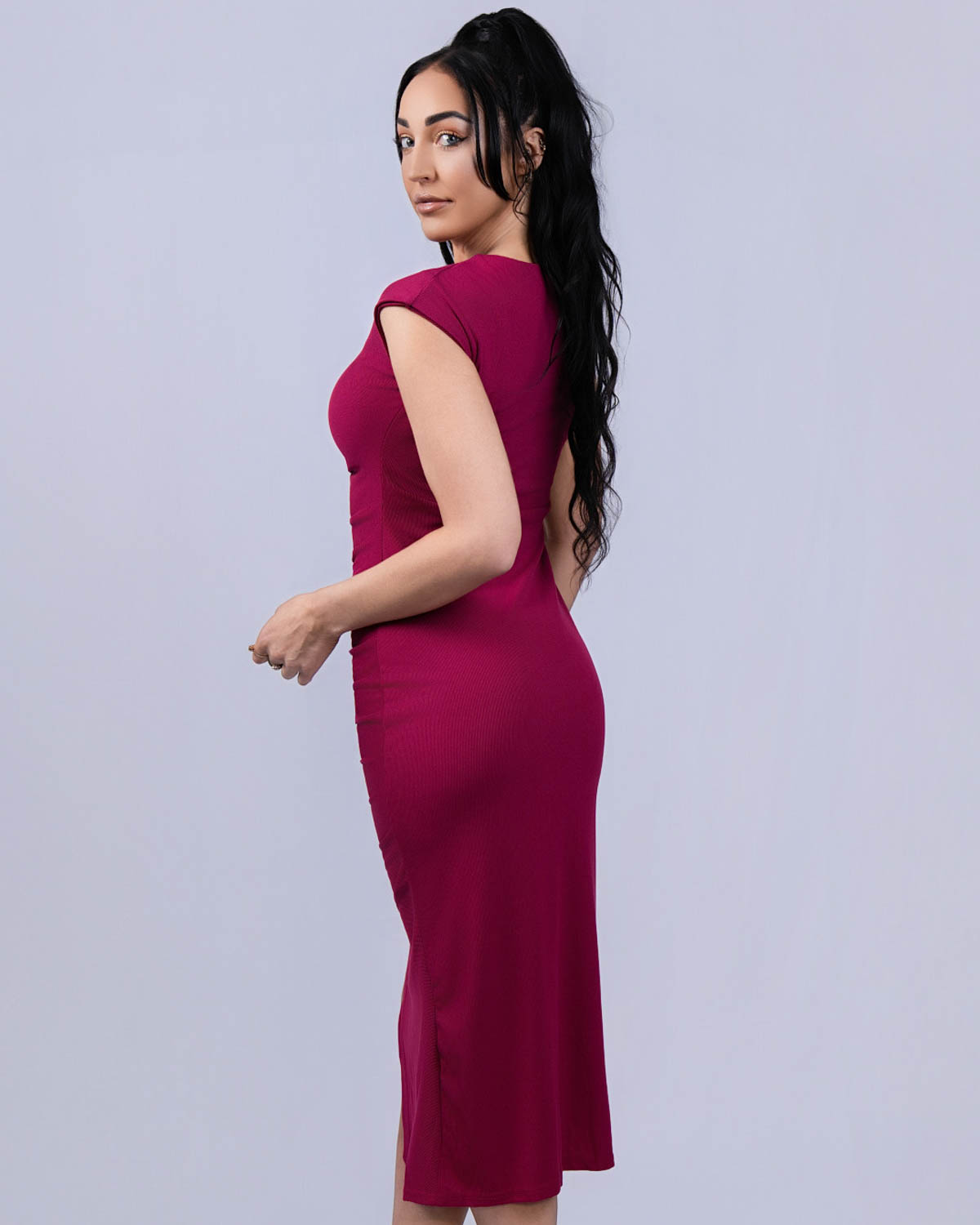 Turn heads in this stunning magenta dress that blends elegance with a touch of daring. Designed to flatter every curve, this knee-length piece features: