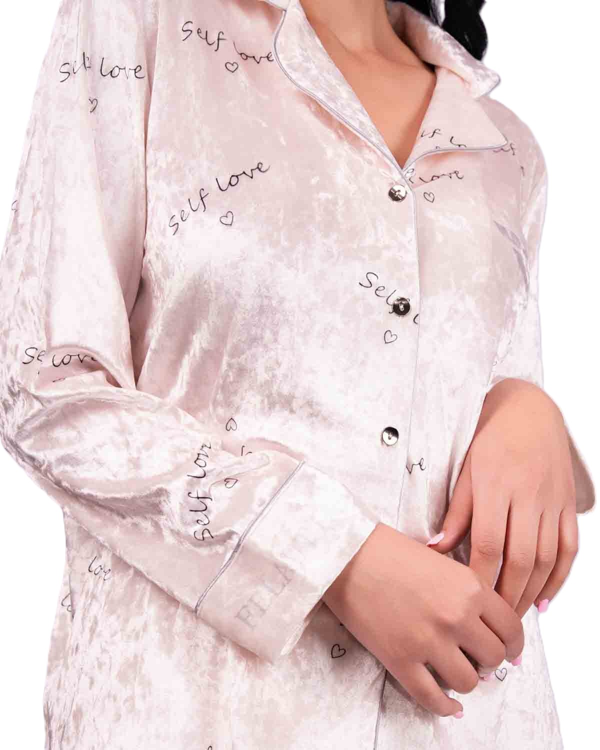 Featuring empowering Self-Love graphics and the Felautia logo on the back, it combines comfort with a bold, uplifting statement. Designed with full-length pajama bottoms only, this set delivers a relaxed, elegant fit, complete with functional pockets for added practicality. Perfect for lounging, relaxing evenings, or elevating your at-home style with Felautias signature touch of luxury.Crafted from luxurious modal silk for an ultra-soft and smooth feel on the skin
