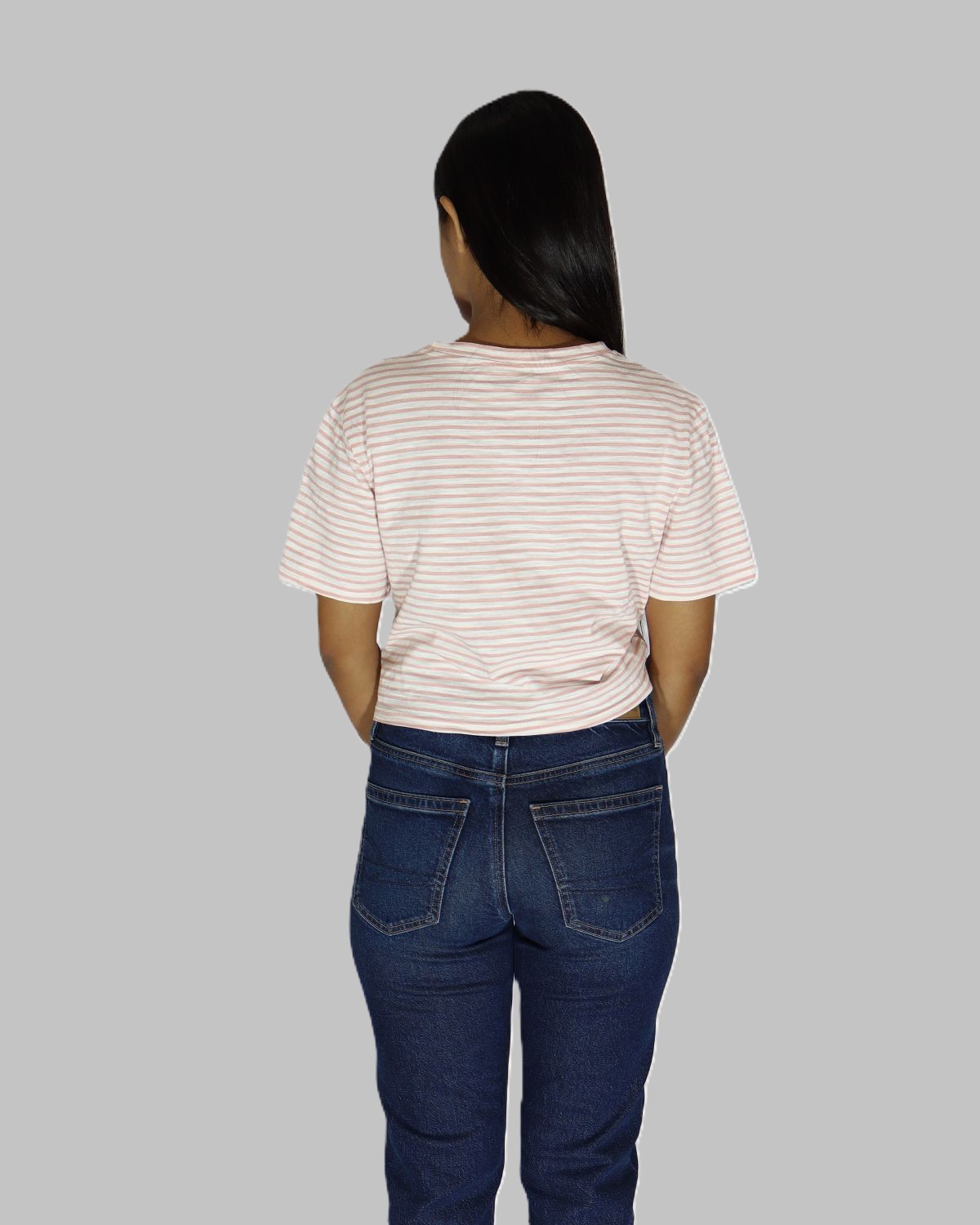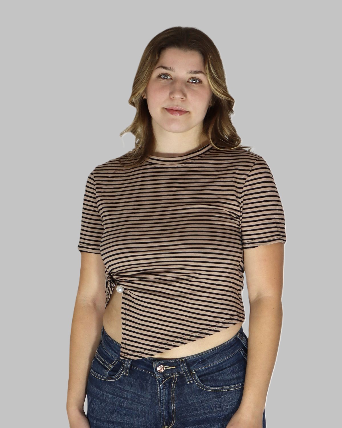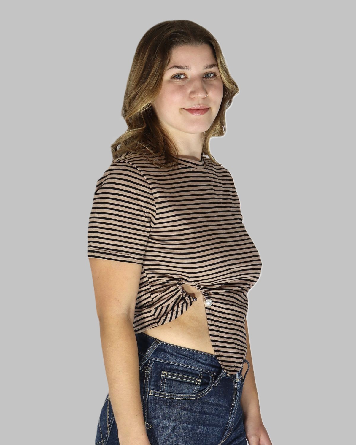 Felautia Ring Accent Striped Tee-where classic stripes meet high-fashion detail. Designed with a playful metallic ring detail on the left corner and a slightly extended, triangular right side hem for an asymmetric silhouette, this tee redefines everyday style.Crafted with breathable cotton to keep you cool and comfortable.
