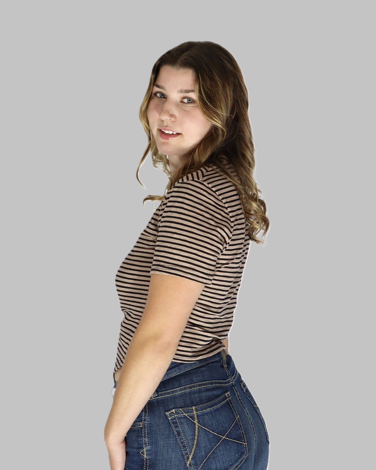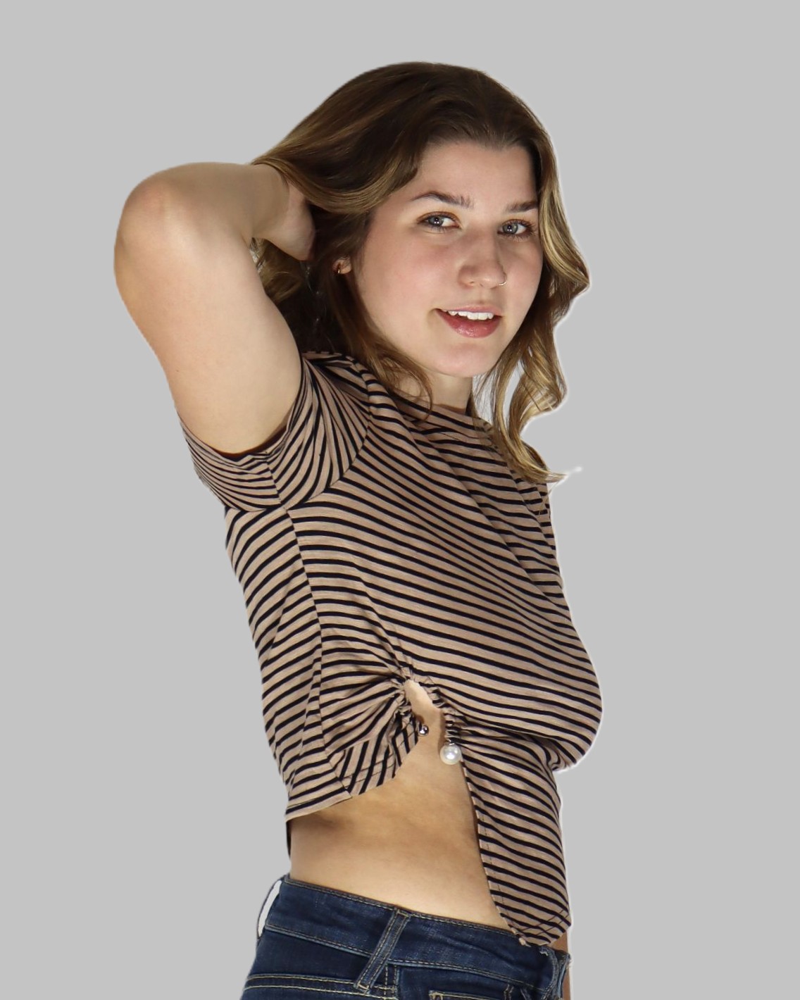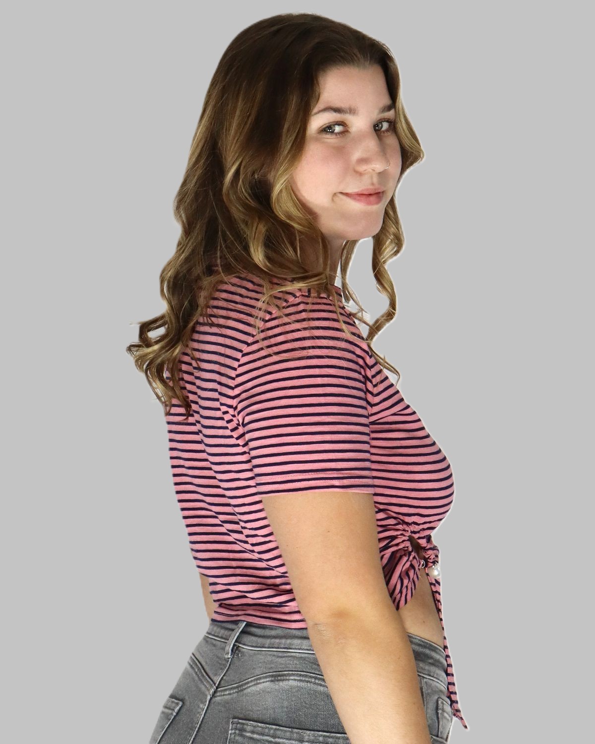 Felautia Ring Accent Striped Tee-where classic stripes meet high-fashion detail. Designed with a playful metallic ring detail on the left corner and a slightly extended, triangular right side hem for an asymmetric silhouette, this tee redefines everyday style.Crafted with breathable cotton to keep you cool and comfortable.