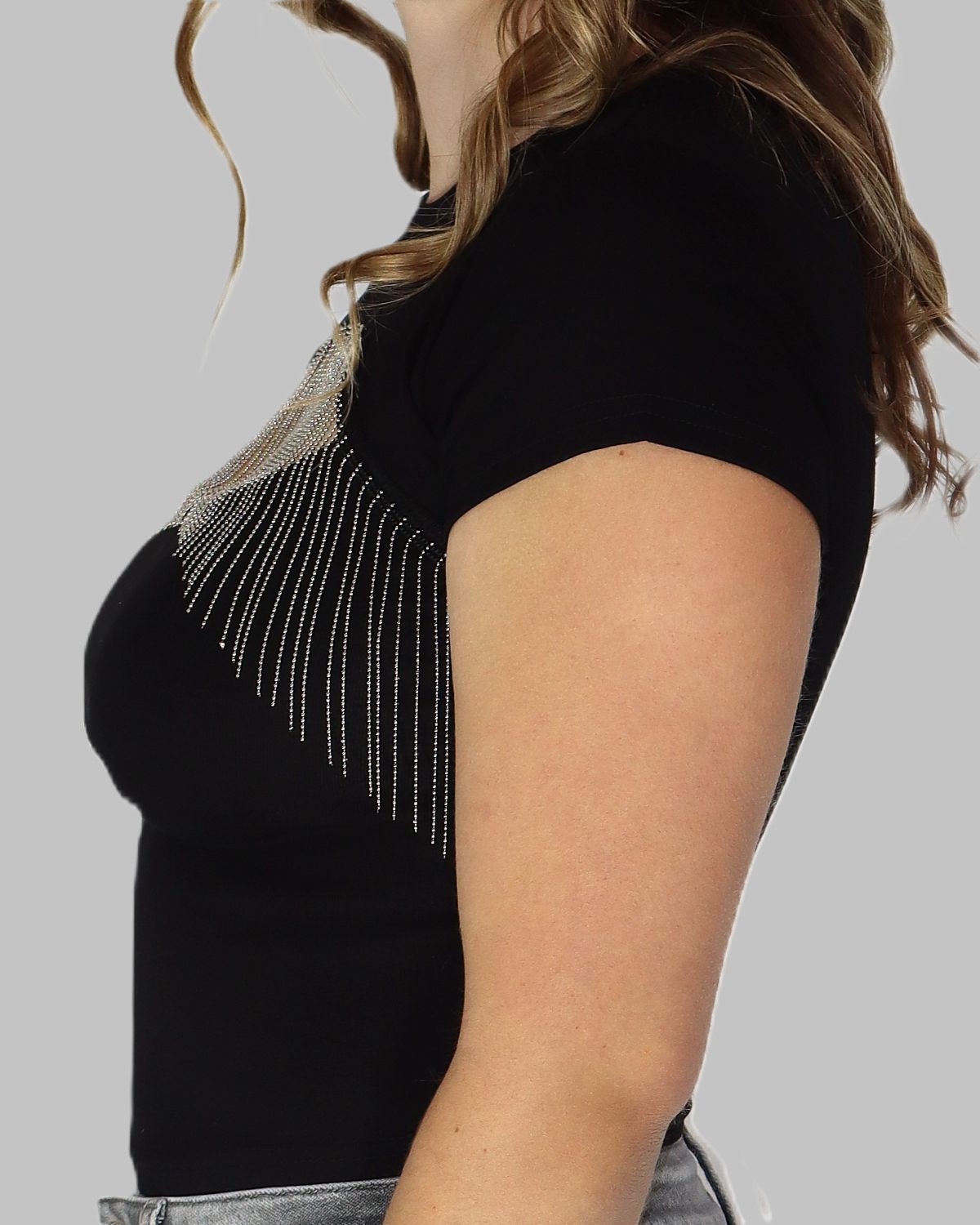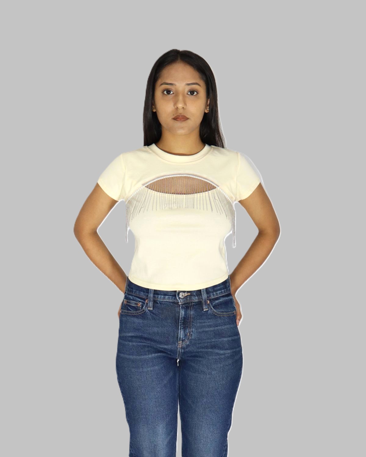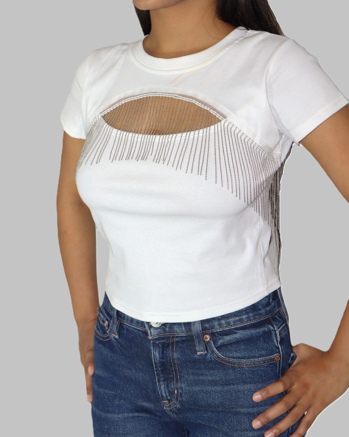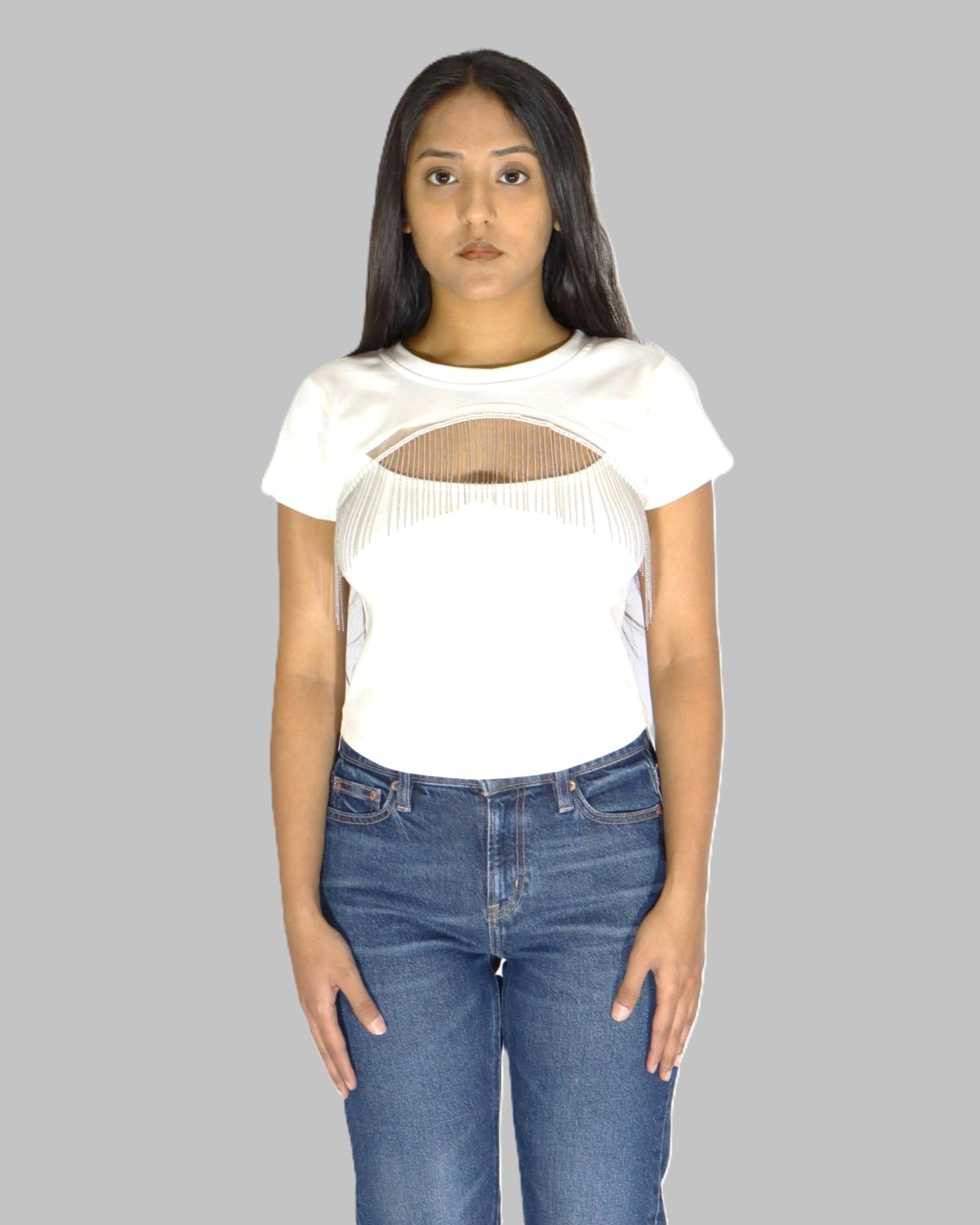 Stand out in style with this unique cotton short sleeve T-shirt, crafted for comfort with a bold twist. The highlight of this top is the delicate thin chain fringe detail running across the front, creating a modern statement look. The chain add a edgy yet chic vibe, making it the perfect piece to dress up a casual outfit.Crafted with breathable cotton to keep you cool and comfortable.