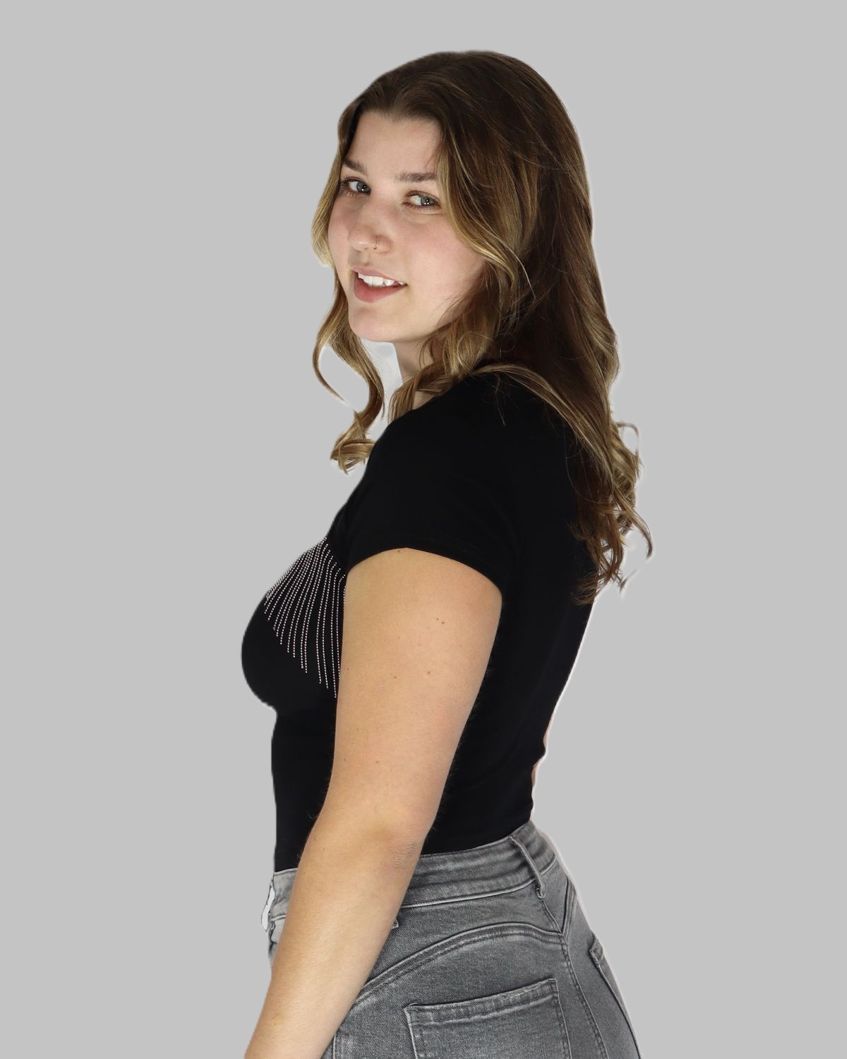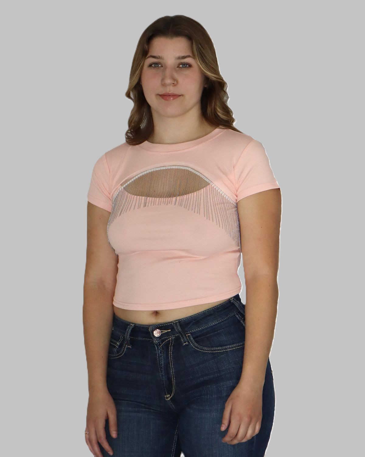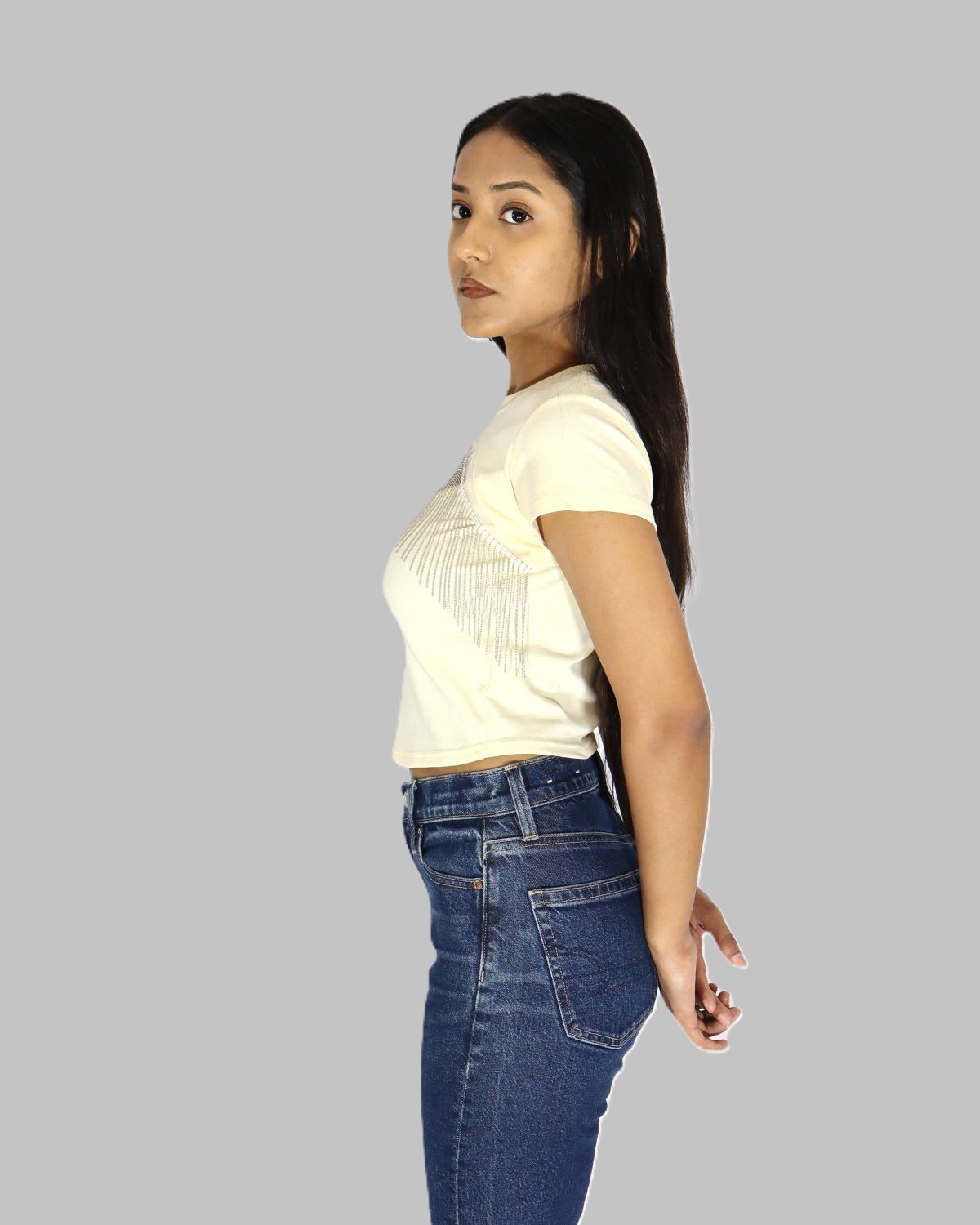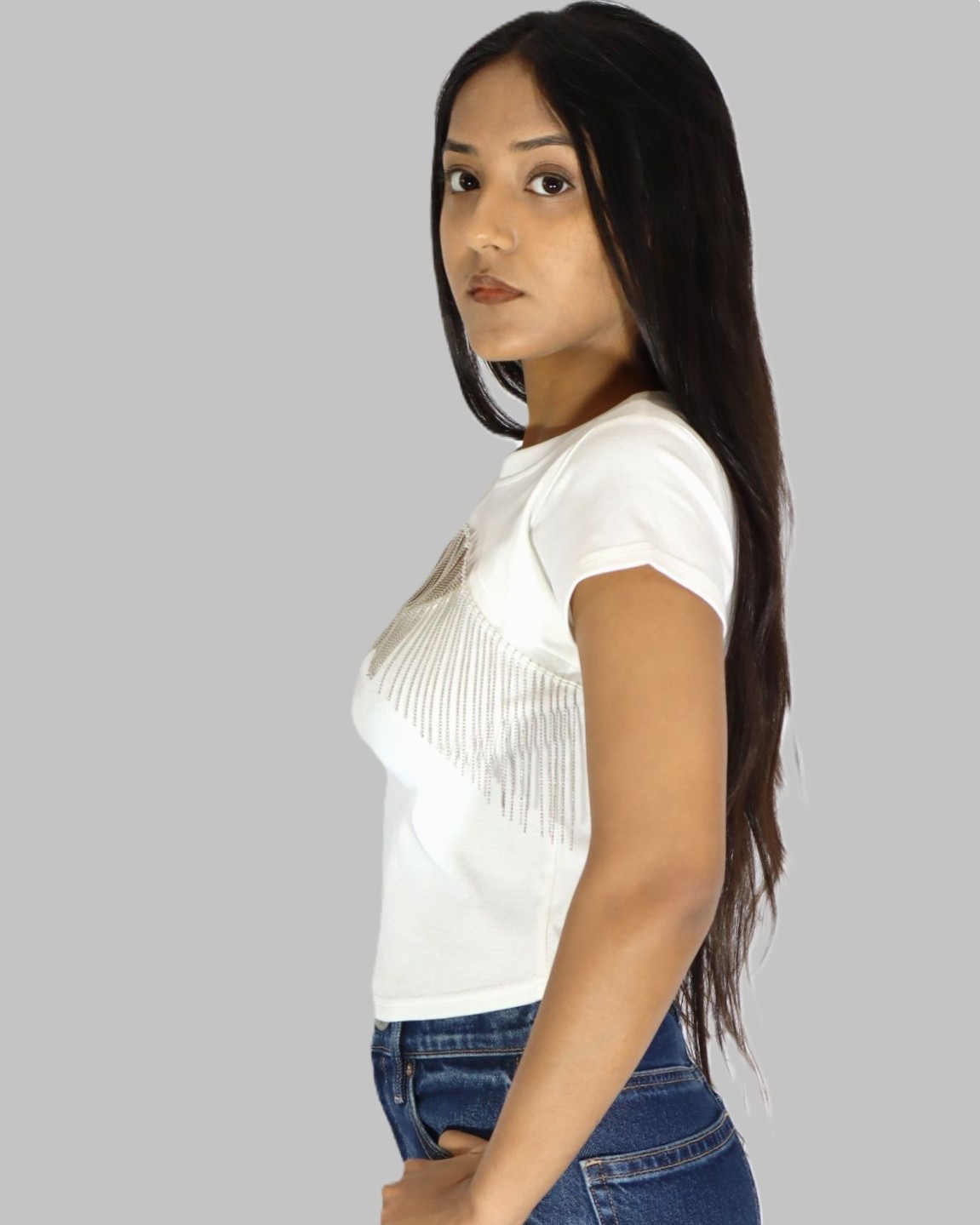 Stand out in style with this unique cotton short sleeve T-shirt, crafted for comfort with a bold twist. The highlight of this top is the delicate thin chain fringe detail running across the front, creating a modern statement look. The chain add a edgy yet chic vibe, making it the perfect piece to dress up a casual outfit.Crafted with breathable cotton to keep you cool and comfortable.