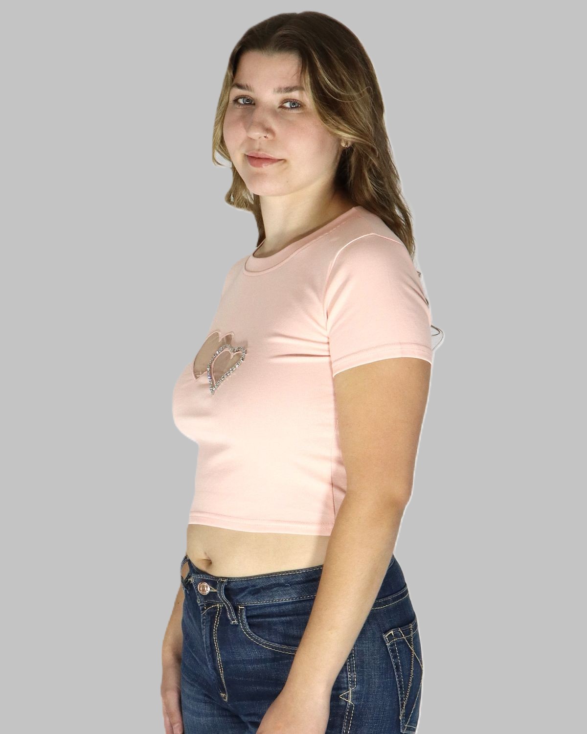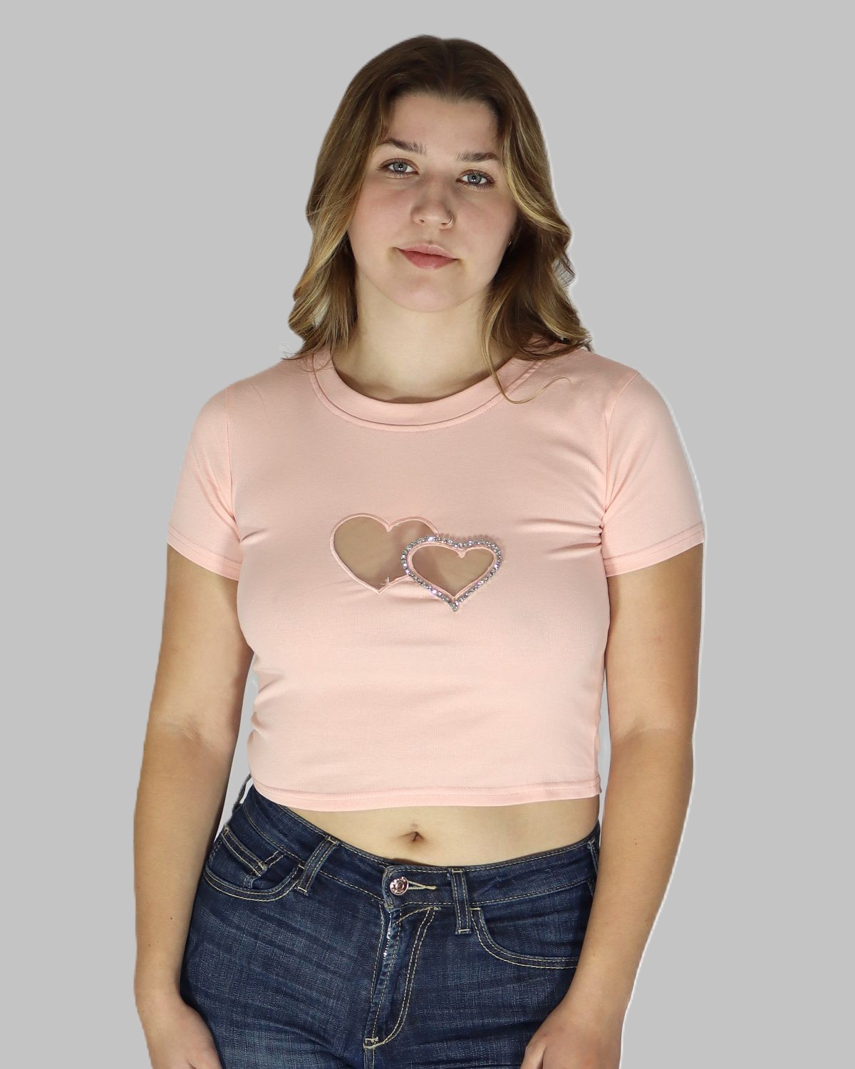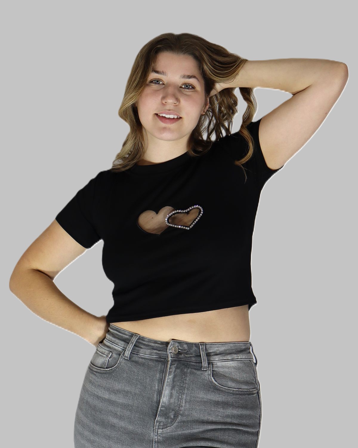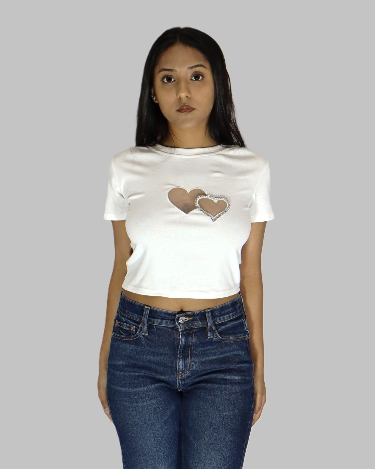 Fall in love with the Felautia Double Heart Net Tee, a sweet yet stylish take on the classic plain tee. Featuring two see-through net heart cutouts in the center, this piece strikes the perfect balance between playful and chic. Made with soft, breathable cotton, it is an effortless way to add a touch of romance to your everyday look.Crafted with breathable cotton to keep you cool and comfortable.