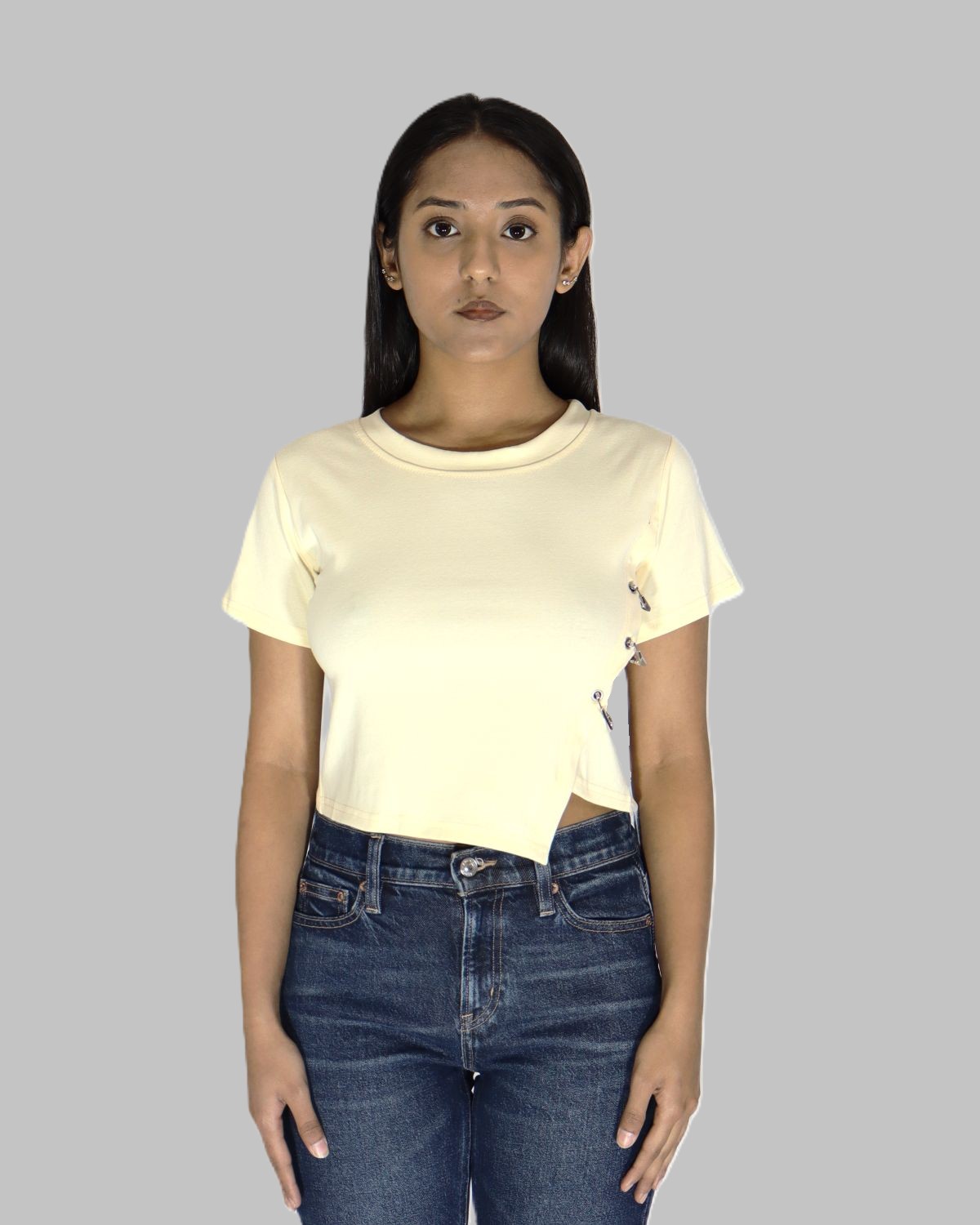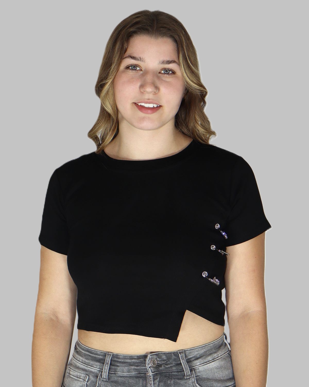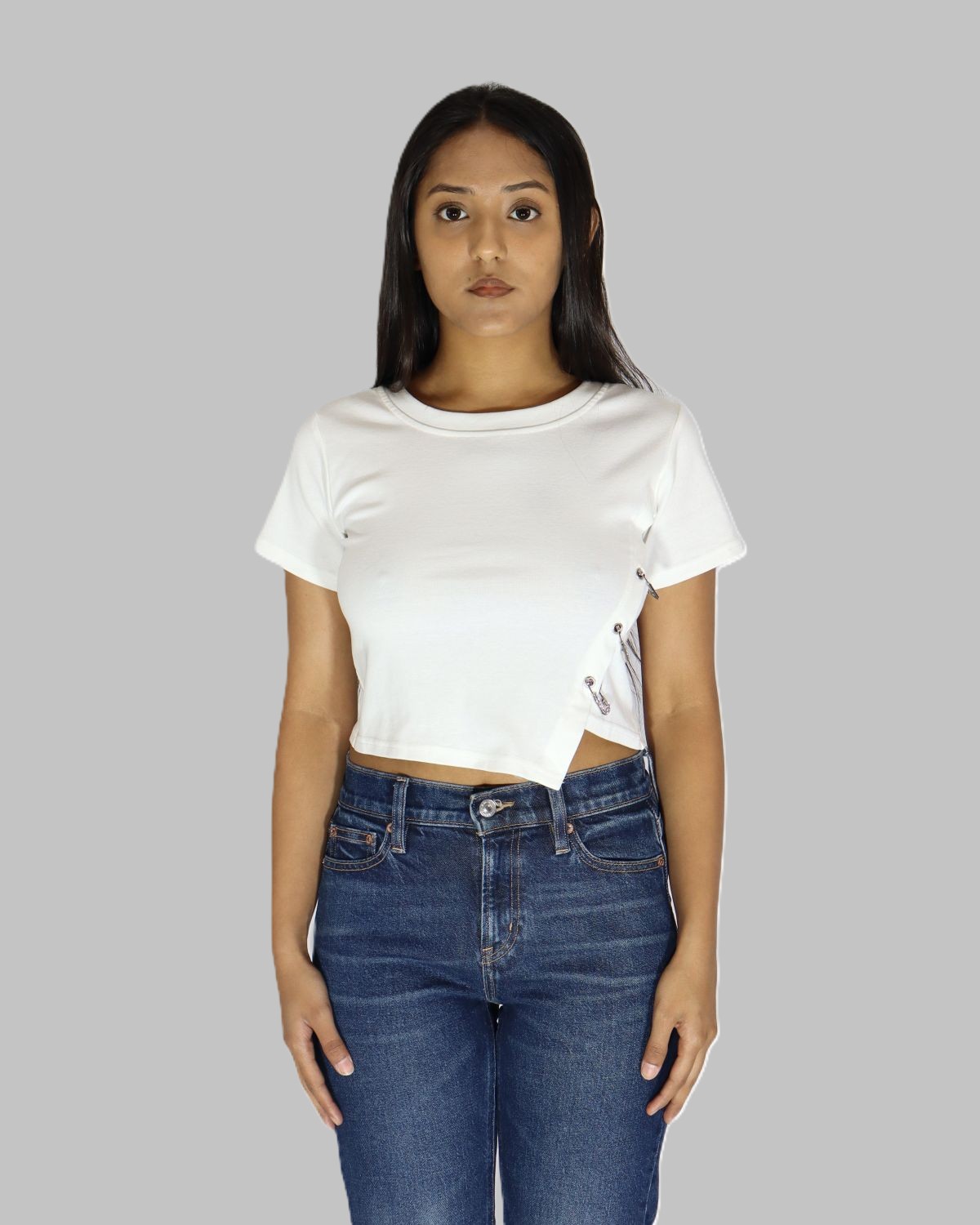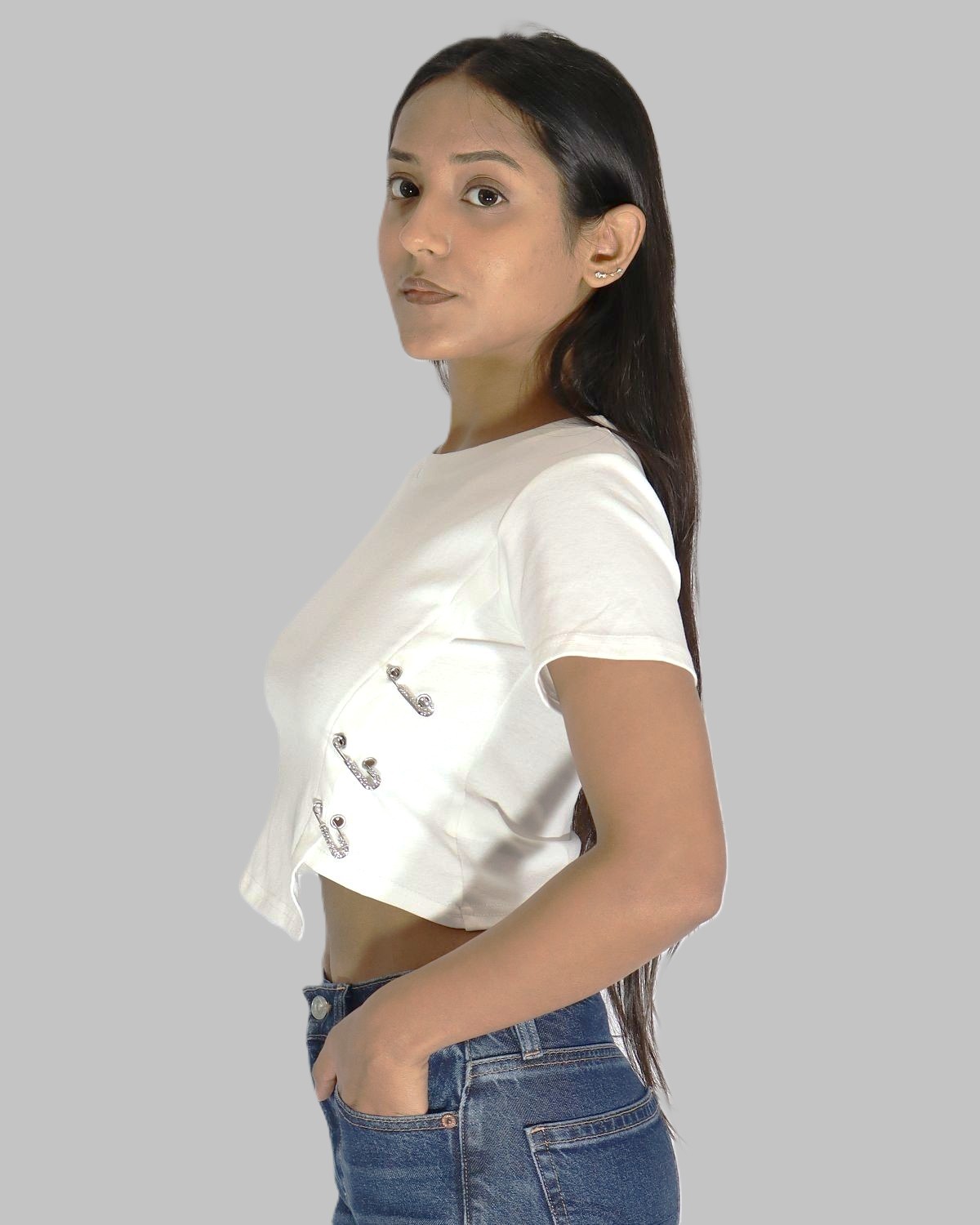 Redefine casual elegance with this luxurious cotton T-shirt, designed with a bold fashion -Forward twist. The highlight of this piece is the stone-encrusted safety pin embellishments along the side, adding a staement sparkle to an otherwise minimalist silhouette. Crafted for soft breathable cotton, this tee blends everyday comfort with a touch of edgy glamour- perfect for those who love to stand out effortlessly.Crafted with breathable cotton to keep you cool and comfortable.