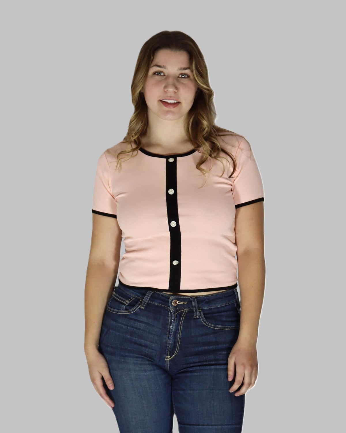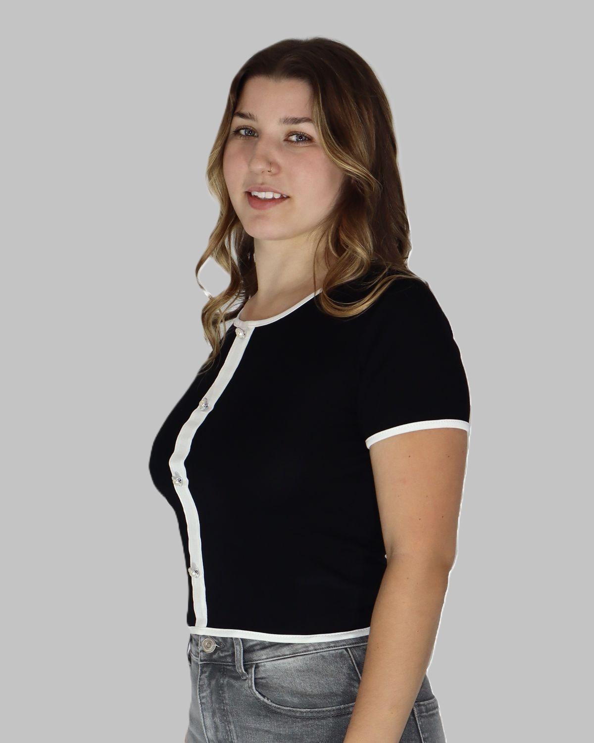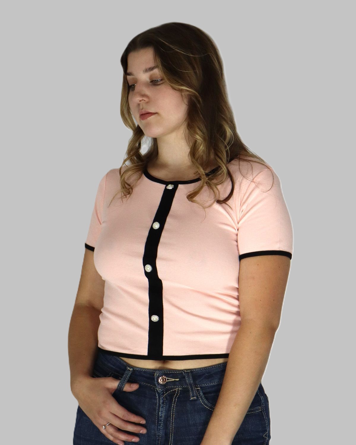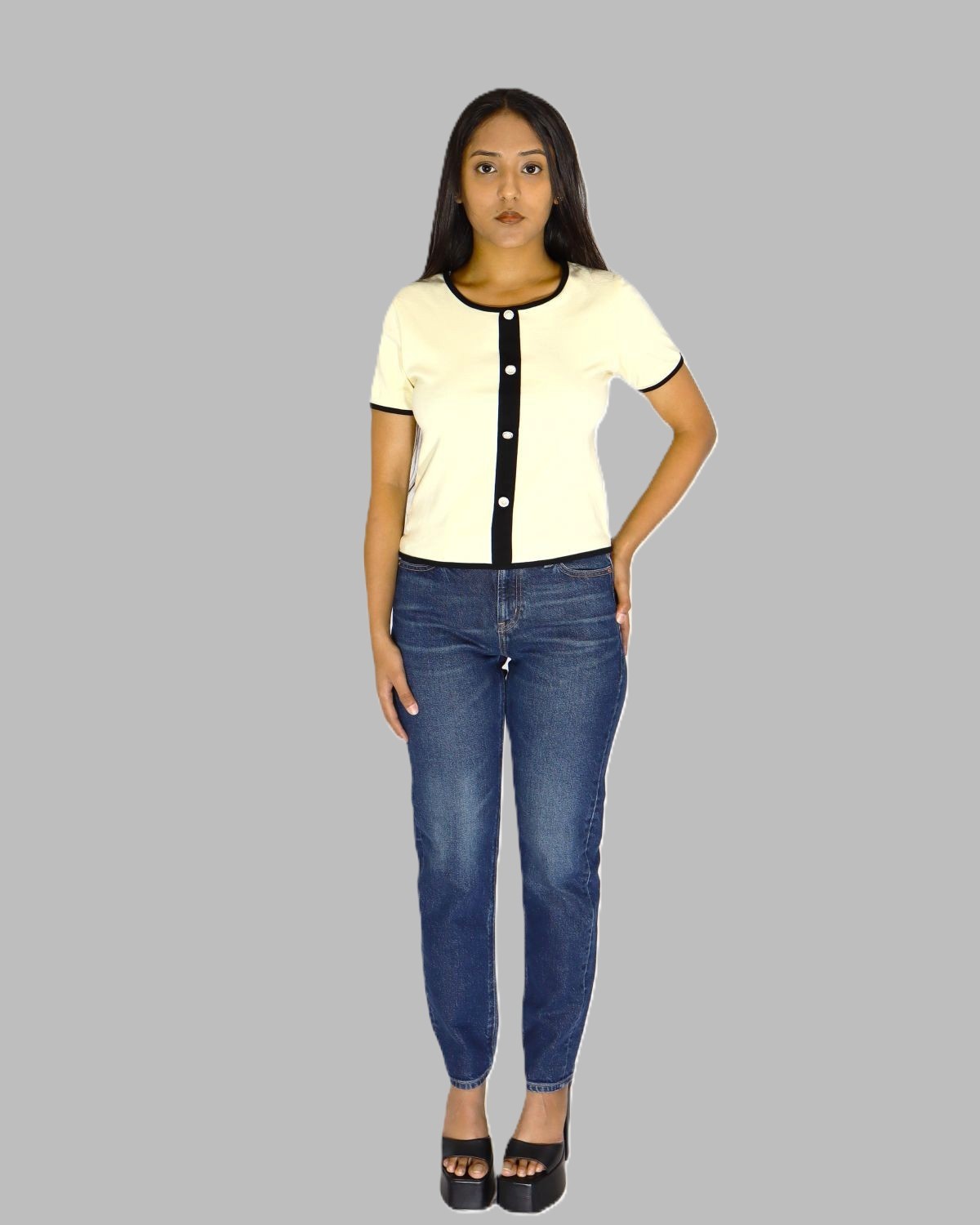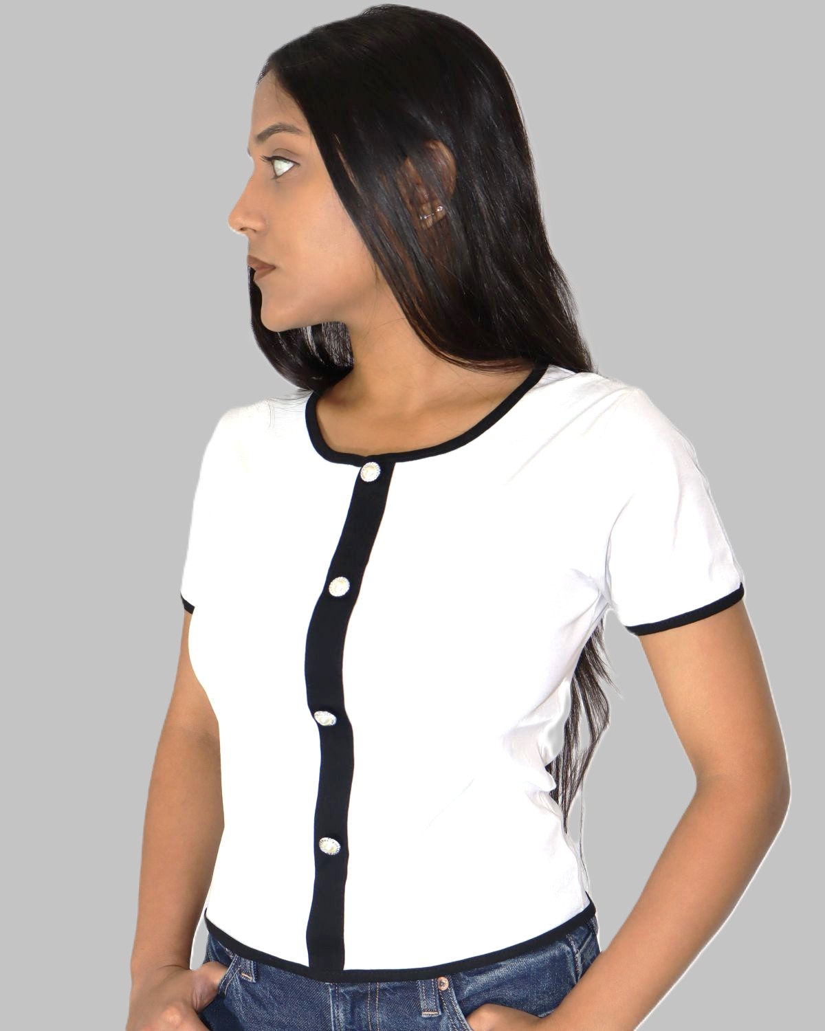 Elevate your everyday look with the Felautia Contrast Trim Cotton Top, featuring elegant decorative buttons that add just the right amount of detail. The contrast trim highlights the neckline and edges, giving this piece a refined, designer-inspired finish. Crafted from soft, breathable cotton, it?s perfect for both casual outings and polished office looks.Crafted with breathable cotton to keep you cool and comfortable.