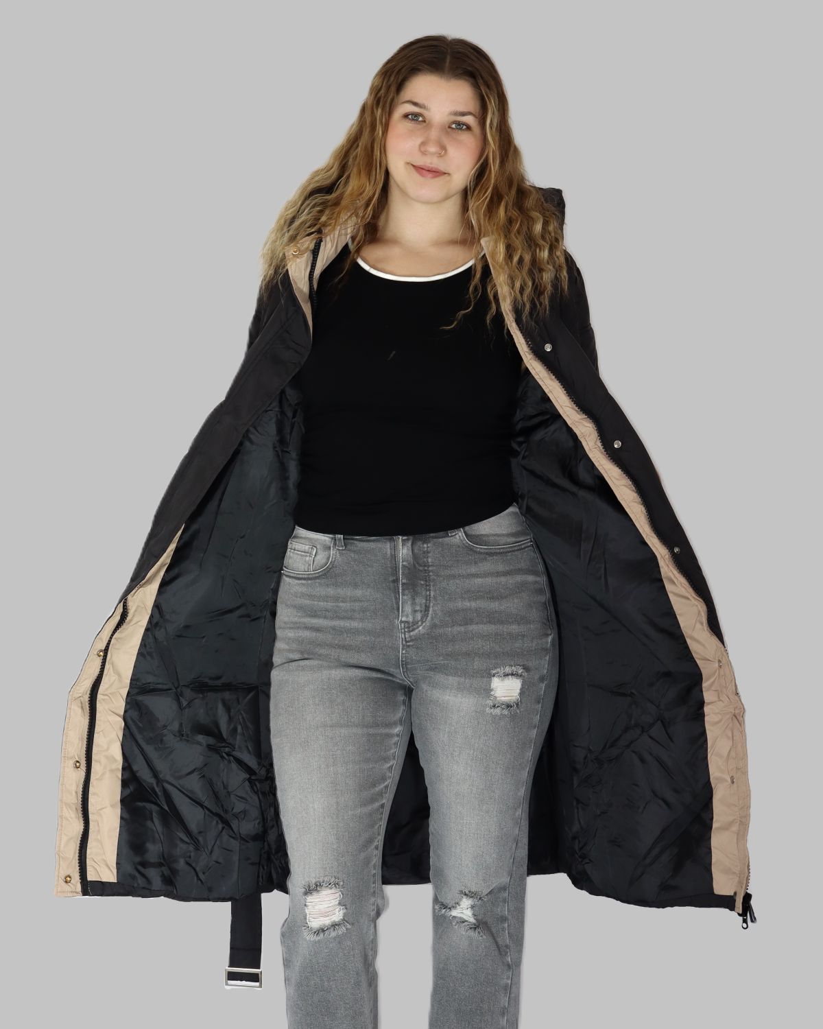 Discover understated luxury with the Felautia Two-Tone Long Jacket- a sophisticated piece that blends modern design with everyday wearability. Crafted in a deep black base accented with cream details, this jacket features oversized front pockets with cream-lined flaps and designer-style dual-color drawstrings for a distinctive finish. The unique stitching pattern elevates the look, creating a piece that feels high-quality and fashion-forward.