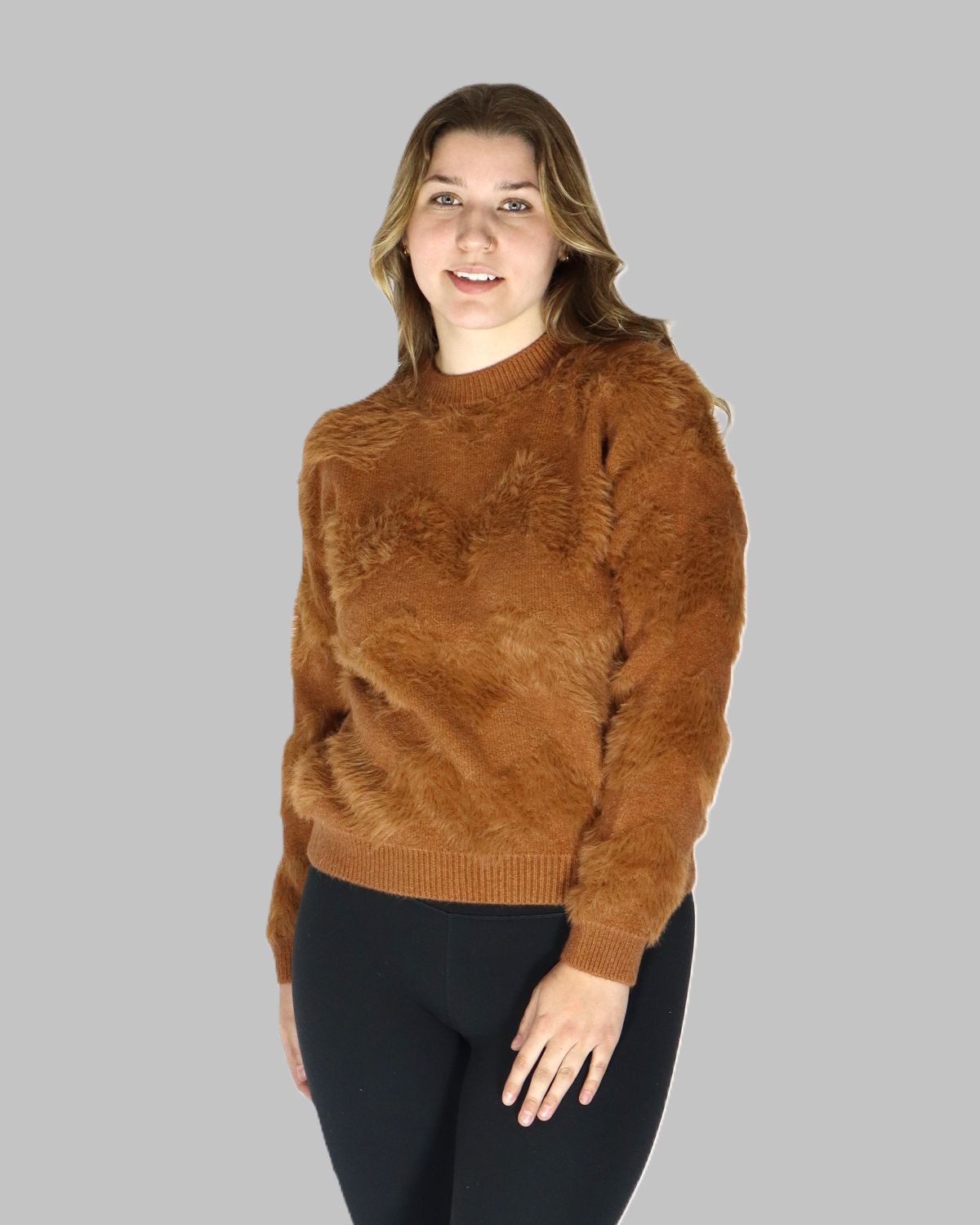 Stay cozy and stylish with this luxurious wool and fur blend sweater, available in off-white, peach, and brown. Featuring a striking horizontal zigzag pattern in the fur sections, it adds texture and visual interest, while the soft wool panels provide warmth and comfort. The combination of materials creates a chic, modern look that is perfect for layering in cooler weather.